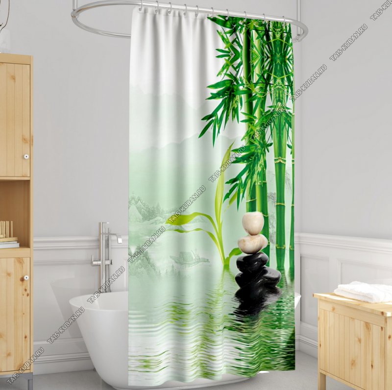 Штора полиэстер Штора полиэстер "люкс" (180х180см) "Тростник" бел/зелен,+ кольца,пласт.подвес (20)
