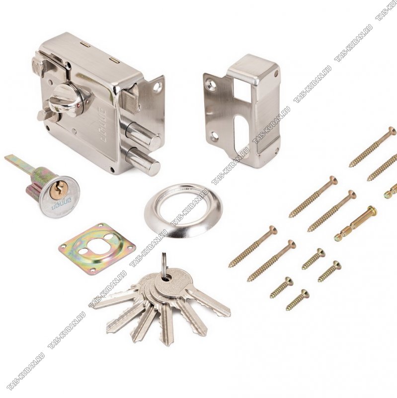 АЛЛЮР Замок накладной цилиндровый с вертушкой. Предназначен для дерев. двери, толщиной до 40 мм. Засов из двух цилиндрических ригелей диаметром 12 мм, с максимальным вылетом 24 мм.Механизм замка под англ.ключ, идет, раздельно с корпусом. Закрывание и открывание замка изнутри производится вертушкой, снаружи ключом. Замок имеет функцию блокировки защелки изнутри с помощью фиксатора на корпусе. Комплектация - 5 ключей, запорная планка, накладка на цилиндровый механизм, крепеж.