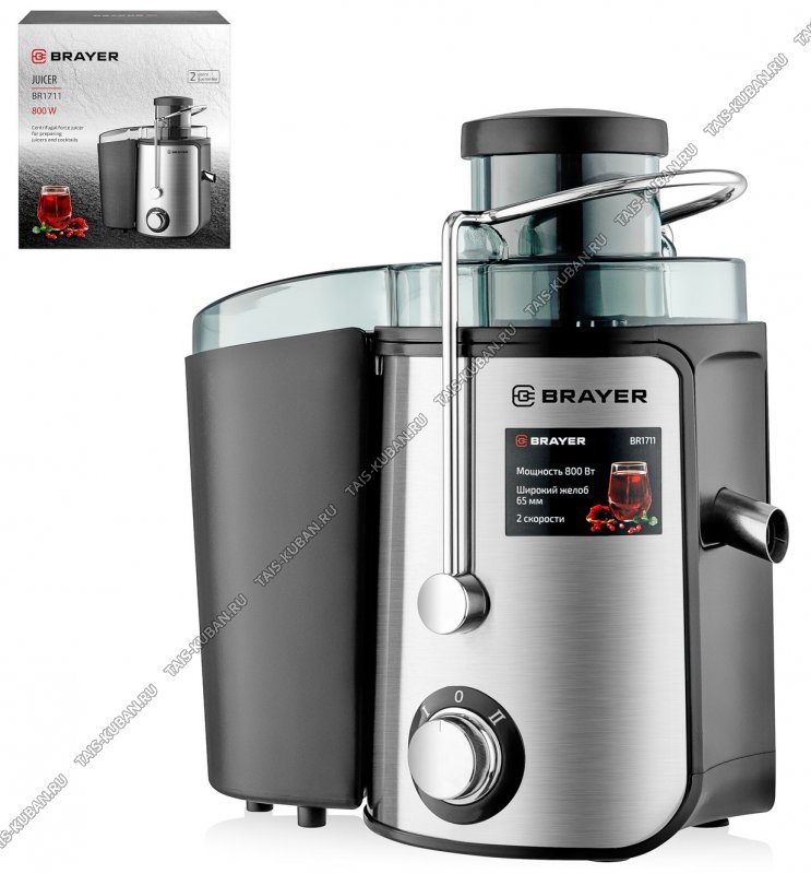 Центробежная соковыжималкаМаксимальная мощность 800 Вт2 скорости для мягких и твердых продуктовШирокий желоб для целого плода 65 ммКорпус из нержавеющей сталиФильтр из нержавеющей сталиКонтейнер для мякоти объемом 1,4 лКонтейнер для соккка объемом 0,5 лПротивокапельная системаПрорезиненные ножки