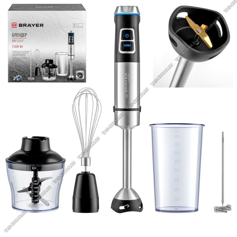 Мощность 1500 ВтПогружная часть блендера из нержавеющей стали с нейлоновым покрытием для предотвращения повреждения посудыЛезвия из титанаКорпус из пластика, декорирован нержавеющей стальюПлавная регулировка скоростиНасадка-венчик для взбиванияСтакан для смешивания 800 млНасадка-блендер для измельчения и смешиванияКапучинаторНасадка-измельчитель объемом 600 мл