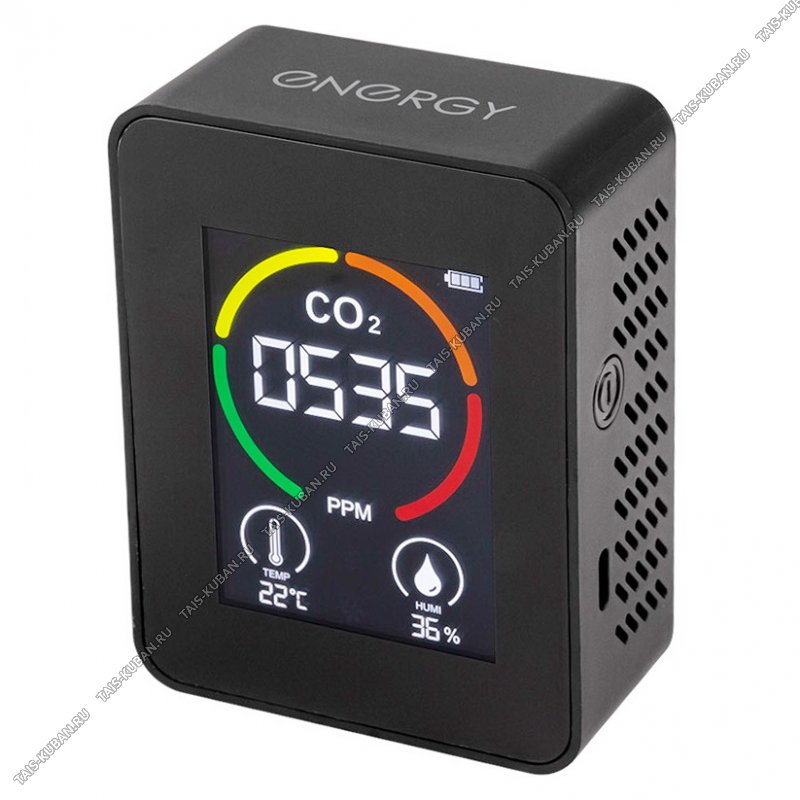 Монитор качества воздуха детектор углекислого газаБольшой жк экран- технология датчика качества воздуха - технология температурного датчика- технология датчика влажности 10% -90%- переключение единиц температуры (цельсий/фаренгейт)- 24 чааааса отслеживание концентрации CO2 400-5000ppmПитание от перезаряжаемой литиевой батареи 1200 мАчЗарядка от USB (кабель в комплекте, 50 cм, Type-C)