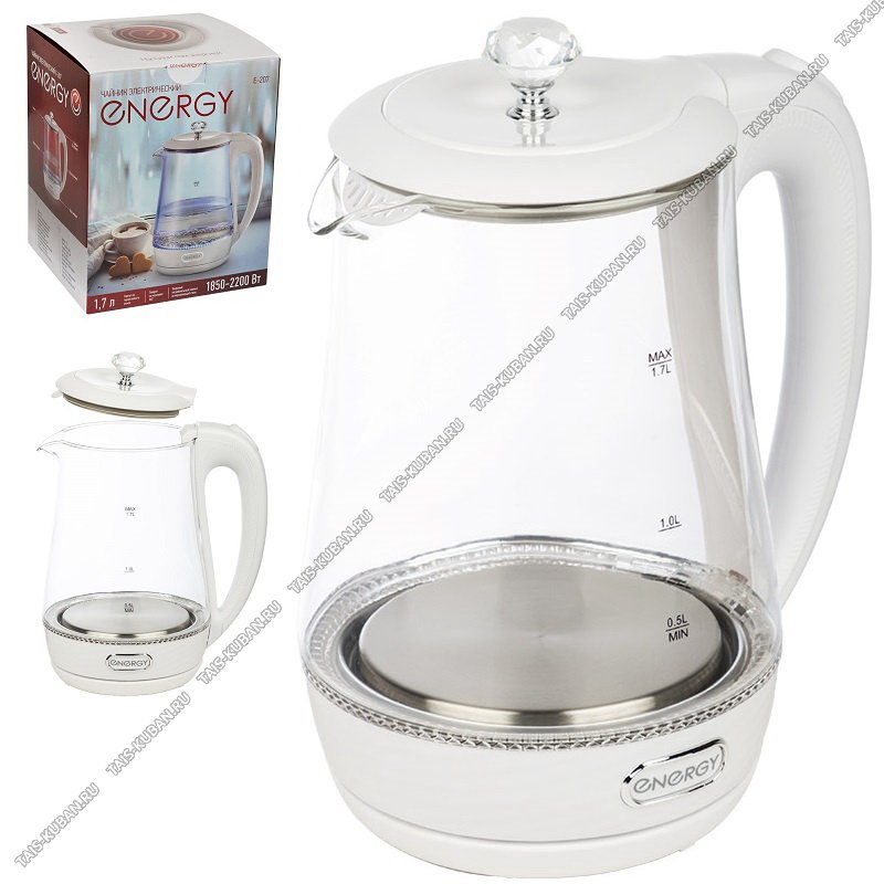 Объем 1,7 лКорпус из термостойкого боросиликатного стеклаШкала уровня водыСветодиодная внутренняя подсветкаЗакрытый нагревательный элемент из нержавеющей сталиПоворот на подставке 360°Защита от работы без воды Автоматический выключателллльМощность 1850-2200 ВтДлина шнура 74 см