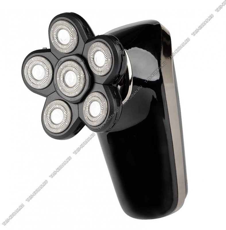 5 плавающих головок, 4 насадки ,(триммер для носа и ушей, триммер для бороды, щетка для головы, массажер для головы), время работы 60 минут, шнур USB в комплекте