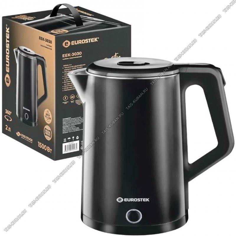 Чайник электрический «Eurostek» EEK-3030, 1500 Вт, Объем 2,0 л , Двойной корпус из нержавеющей стали и пластика, кнопка открывания крышки, шкала уровня воды, дисковый нагревательный элемент, световая индикация работы, вращения чайника на подставке нааа 360, автоматическое отключение при закипании и при недостаточном количестве воды.