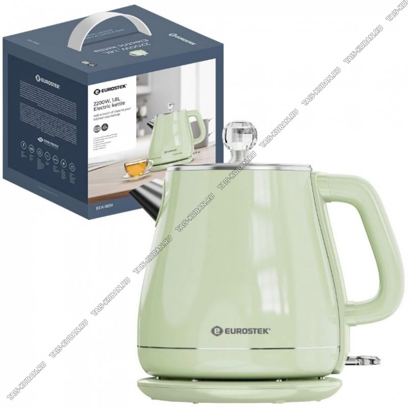 Электрический чайник Eurostek EEK-1839Объем 1,8 л , мощность: 2200 Вт, технология двухслойного корпуса COOL TOUCH, дисковый нагревательный элемент, длина шнура 0,9 м, световая индикация работы, вращения чайника на подставке на 360, автоматическое оооотключение при закипании и при недостаточном количестве воды.