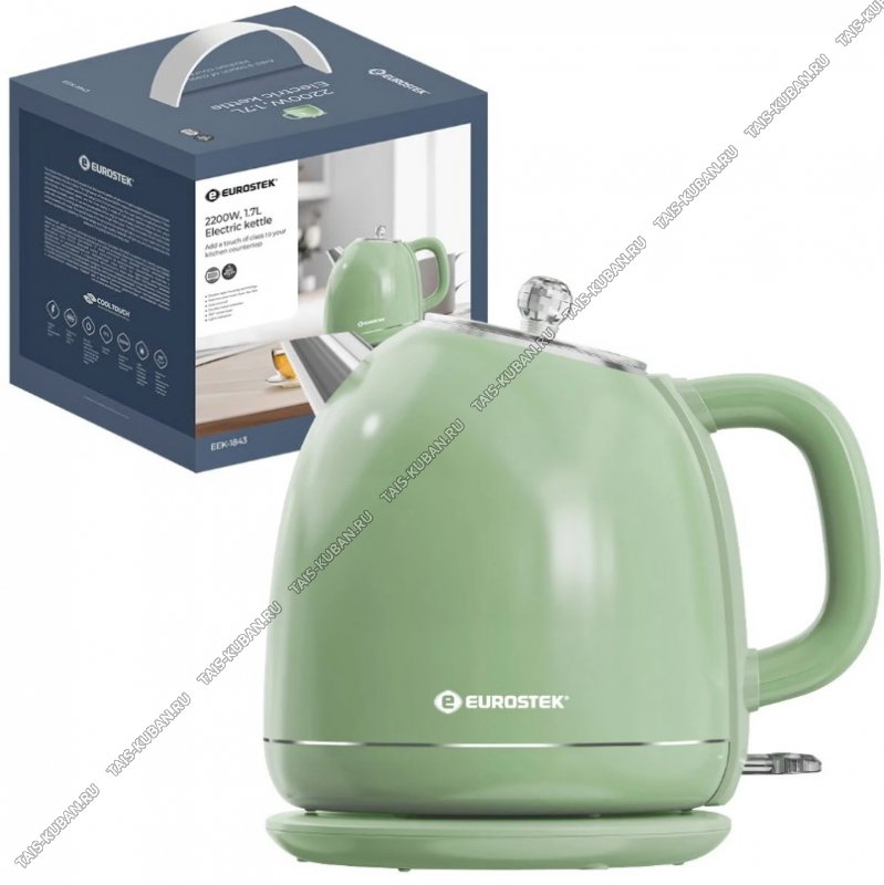 Электрический чайник Eurostek EEK-1843Объем 1,7 л , мощность: 2200 Вт, технология двухслойного корпуса COOL TOUCH, дисковый нагревательный элемент, длина шнура 0,9 м, световая индикация работы, вращения чайника на подставке на 360, автоматическое оооотключение при закипании и при недостаточном количестве воды.