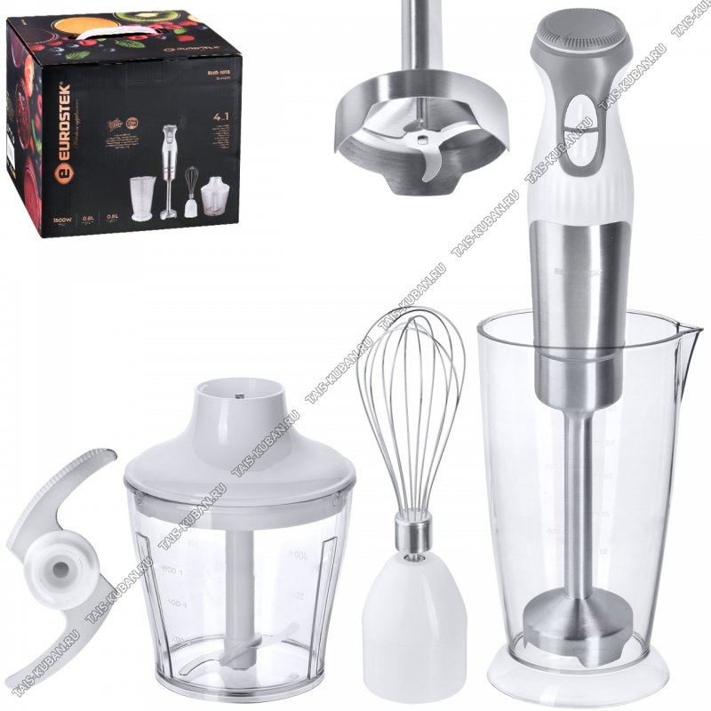Блендер погружной Eurostek EHB-1015Максимальная мощность: 1500 ВТ, 2 скорости, объем измельчителя: 800 мл. Материал чаши - пластик, Материал венчика, погружного блендера с 4-мя лезвиями - нержавеющая сталь; объем мерного стакана: 800 мл, защитный замок.