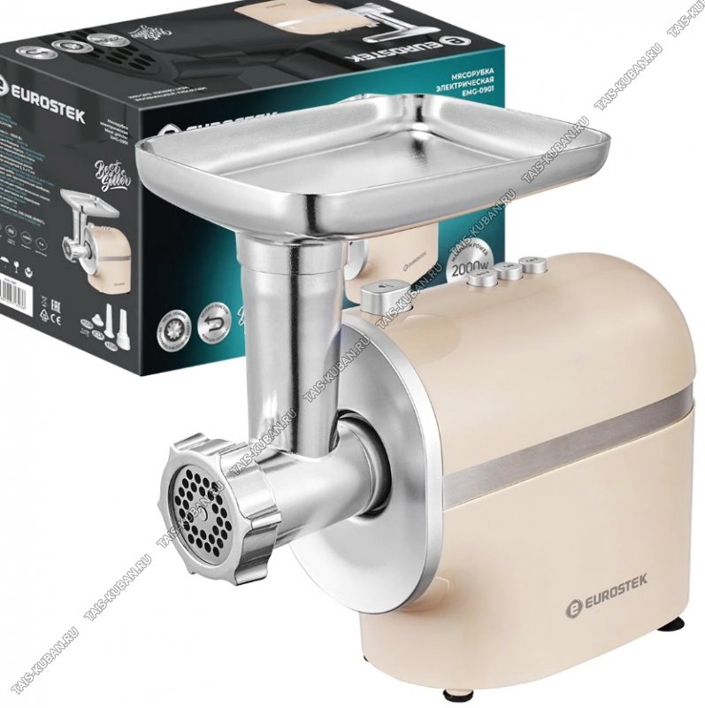 Мясорубка электрическая Eurostek EMG-0901. Мощность 2000Вт, пластиковый корпус, функция Реверс, нож и диски из нержавеющей стали, перфорированные диски для мяса, размер отверстий 3, 5, 7 мм, насадка Кеббе, насадка для приготовления колбасок, противоскользящие ножки, Защита двигателя от перегрузки, длина шнура 1м