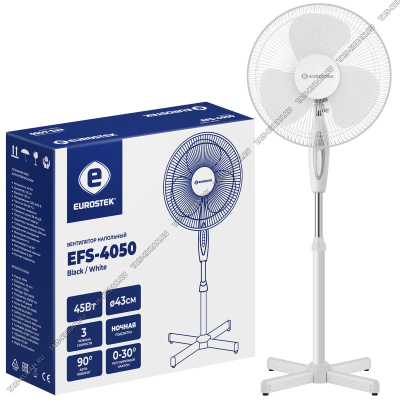 Вентилятор напольный EUROSTEK 45Вт .белый в индивид.упаков,d43см,3скор,бесшумн,ночн.подствет,регулир.высоты до 125см,регулир.наклон,поворот на 90° (1)