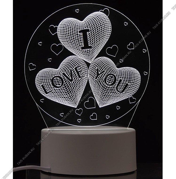 Ночник-светильтник 3D "Три сердца" 3Вт,h17см, красный свет, питпние от USB, подарочная упаковка (50)