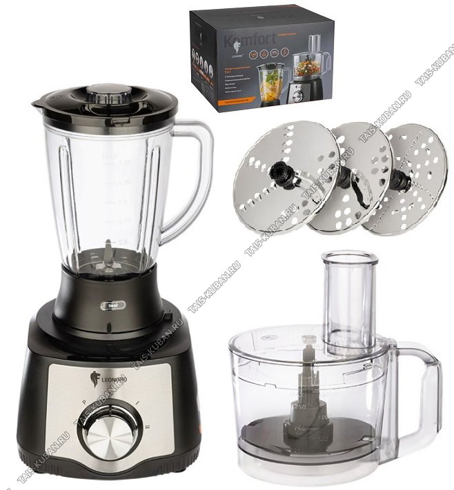(блендер,соковыжималка для цитрусовых, мультирезка,измельчитель, замес жидкого теста), 4насадки (3-диска, для теста), кувшин 1.5л, лезвие из нержавеющей стали, защита от перегруза, автоматическая блокировка при неправильной сборке