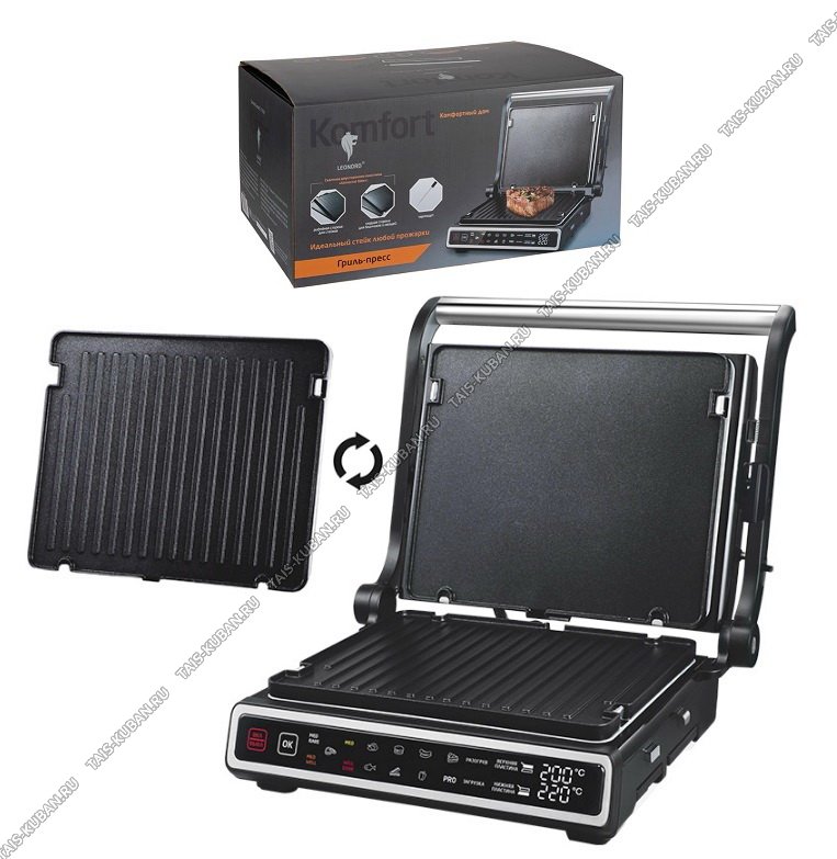 открытие на 180°, max t 230С°, 11программ, отдельное регулирование температуры для верхней и нижней, поддон для жира, защита от перегрева, корпус пластик+нержав