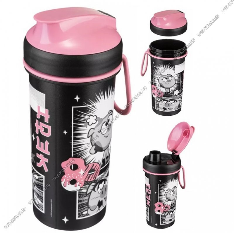 Стакан 0,4л д/холодых напитков "Смешарики" черный (d7 h16см) откидная крышка,с петлёй, Бытпласт (12)