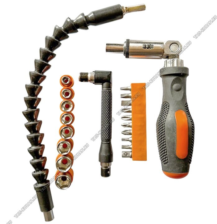 Н-р отвертка реверс.с шарнир. н-р 21пред (торц.голов 5-12мм+биты(PH1,PH2,PZ1,PZ2,SL4,SL5,SL6,T15,T20)+адаптер 1/4+адаптер угол. и гибк.удлинит.д/бит), блистер (12)