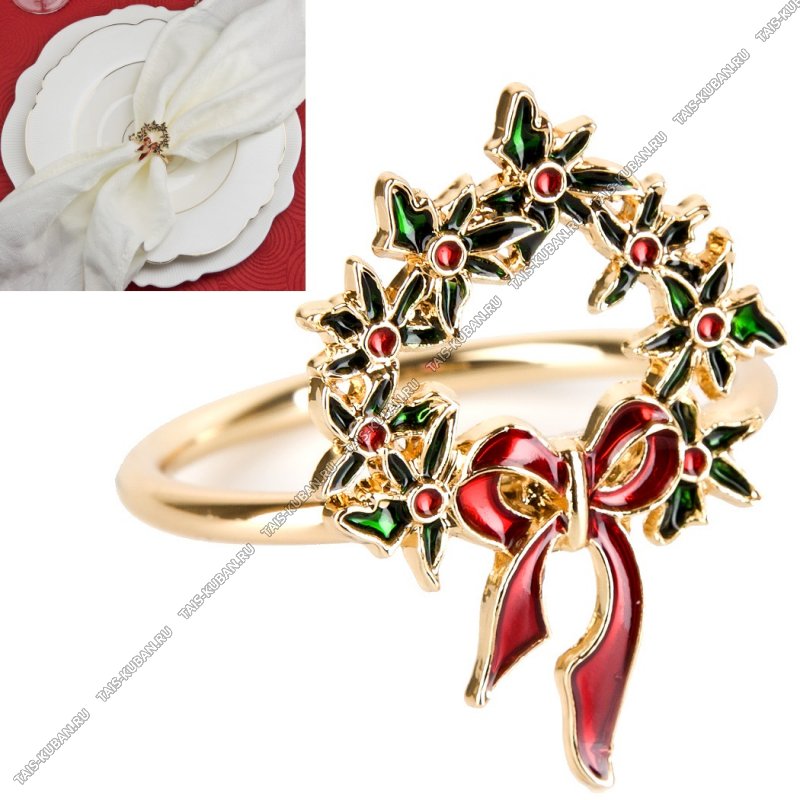Кольцо д/тканев.салфеток (металл) d4см "Рождественский венок", стразы, пакет (12)