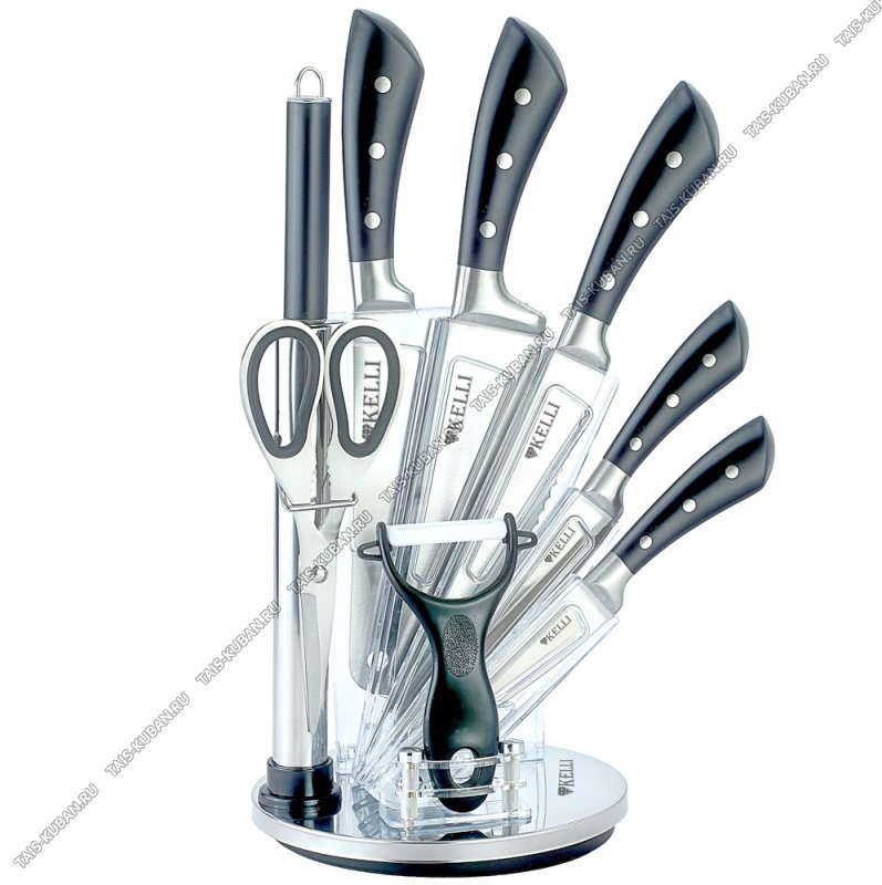 Н-р ножей 8пр. на подст.(пов.20см,д/хлеба 20см,топор.16см,д/резки 12см,д/овощ.9см,овощечист.керам,точилка,ножницы) черн,п/у (6)