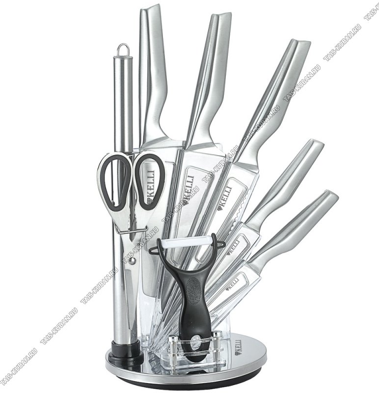 Н-р ножей 8пр. на подст.(пов.20см,д/хлеба 20см,топор.16см,д/резки 12см,д/овощ.9см,овощечист.керам,точилка,ножницы) эргономич.руч, стальной,п/у (6)