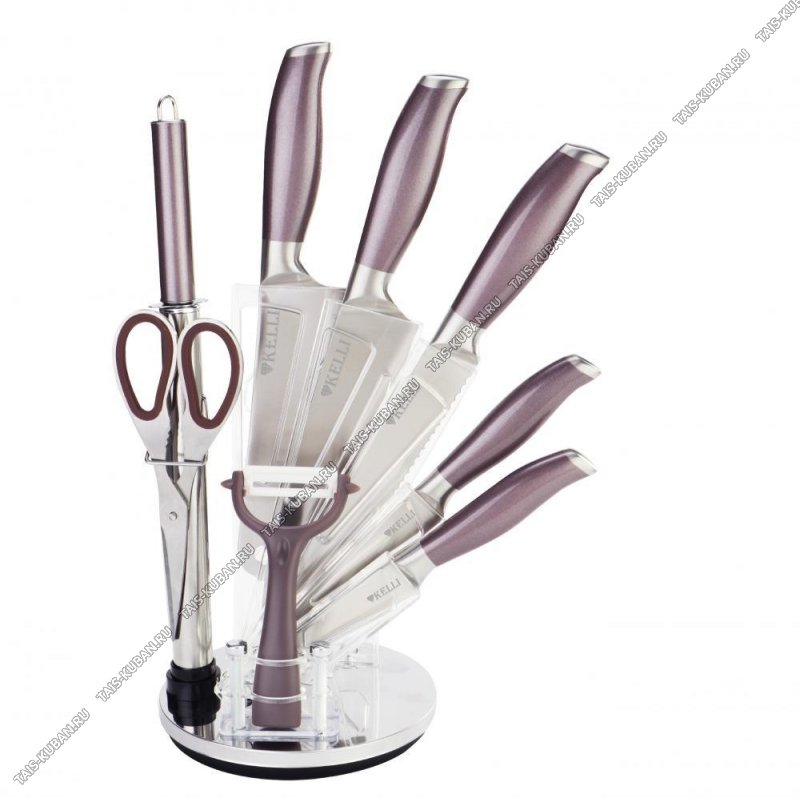 (ножи поварской 20/д/хлеба 20/топорик 16/разделочный 12/д/овощей 9см,овощечистка поперечная с керамическим лезвием,ножницы,мусат) цельнометаллические,нержавеющее лезвие 18/10,фиолетовый "металлик",подарочная упаковка,Kelli
