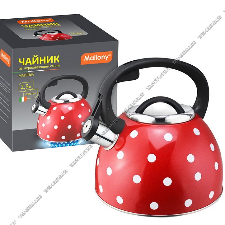 Чайник нерж 2,5л "горох белый" красн,свист,одинарн.дно,ручка нейлон черн,глянец,п/у (12)
