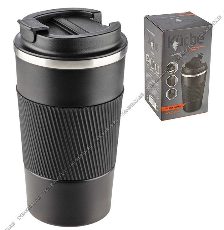 Термокружка (нерж) 0,5л "Leonord/Coffe" пласт.крышка-поилка с защелк,силик вставк на корпус,прорезин дно,черн.матов,п/у (24)