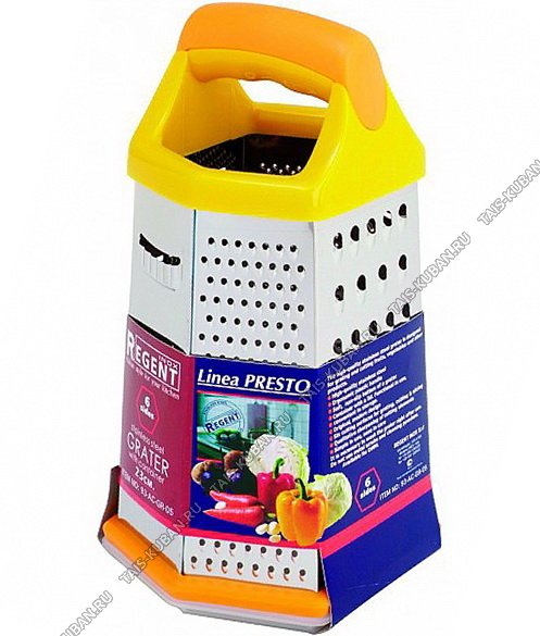 Терка 6-ти гран, h23см,нерж.сталь,пласт.ручк,прорезин.дно,желт-оранж (12) Терка 6-ти гран, h23см,нерж.сталь,пласт.ручк,прорезин.дно,желт-оранж (12)