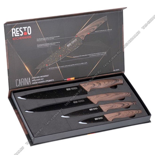 Набор ножей 4предмета в подарочной упаковке на магните "Carina"(поварской 20см,разделочный 20/универсальный 13/д/овощей 9см),черное мраморное лезвие нержавеющая сталь 3CR13,бакелитовая ручка "дерево",подарочная упаковка (10)