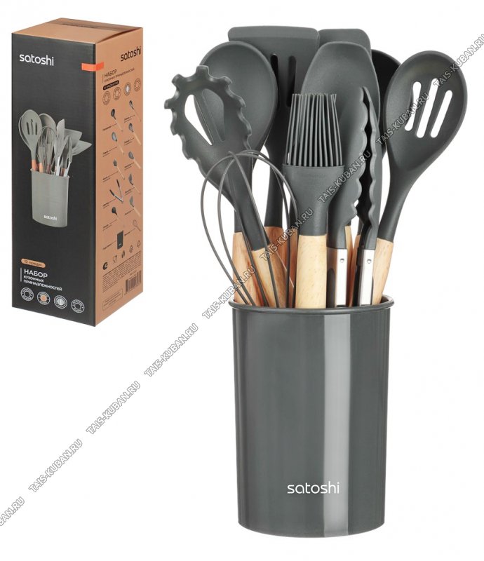 (ложка для спагетти L30,5см/половник L31см/ложка с прорезями L31см/ложка д/салата L31см/кисточка L27см/лопатка кулинарная L31см/щипцы L27см/лопатка с прорезями L31см/ложка гарнирная L31см/лопатка L31см/венчик L24см),бамбук+силикон,подарочная упаковка,Satoshi