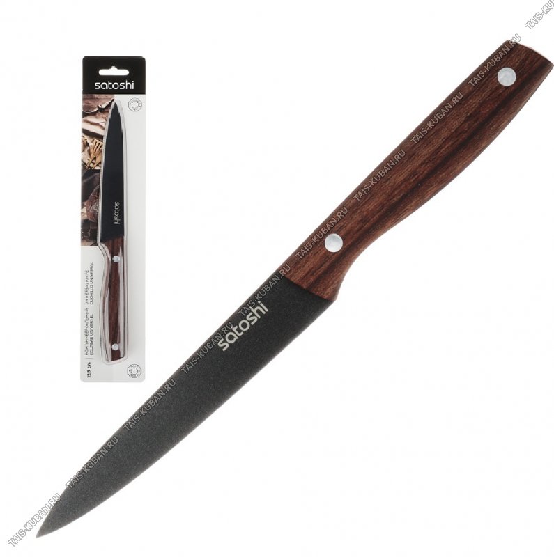 черное нержавеюще лезвие с антиналипающим покрытием,бакелитовая ручка "дерево",блистер,Satoshi