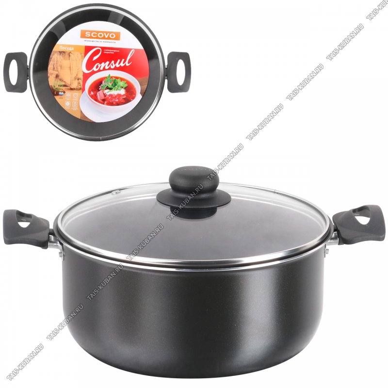 "Consul" Кастрюля 4,5л черный,стекл.крыш,2пласт.ручк,толщ.стен. и дна 1,8мм