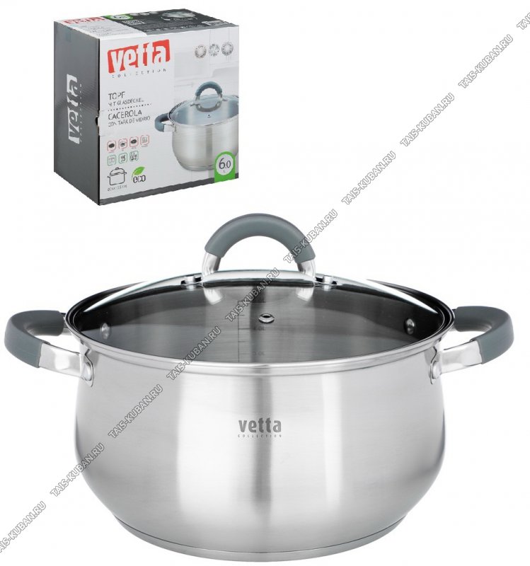 Vena Кастрюля 6,0л d24см,ф.груша,индукц.капсул.дно,ручки-дуги полые металл/силикон серый,стекл крыш рука-дуга полая металл/силикон серый,матов,п/у (12)