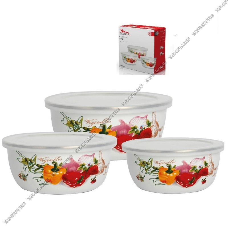 Миска н-р 3шт "Перец" бел (0,7/1,0/1,7л;d14/16/18см) с пласт.крыш, п/у (12)