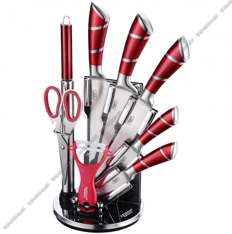 (нож-топорик 17/поварской 20/разделочный 20/универсальный 12,5/д/овощей 9см/мусат/ножницы/овощечистка поперечная ) толщина лезвия 2,0мм,нержавеющие ручки с декором,цвет красный,подарочная упаковка,Zeidan