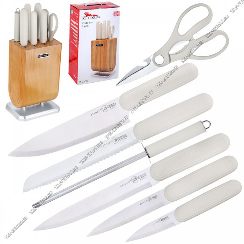 кремовый (ножи поварской 20/д/хлеба 20/,универсальный 13/,разделочный 20/д/овощей 9см,ножницы,мусат д/заточки) нержавеющее лезвие,прорезиненные ручки с декором,подарочная упаковка,Zeidan
