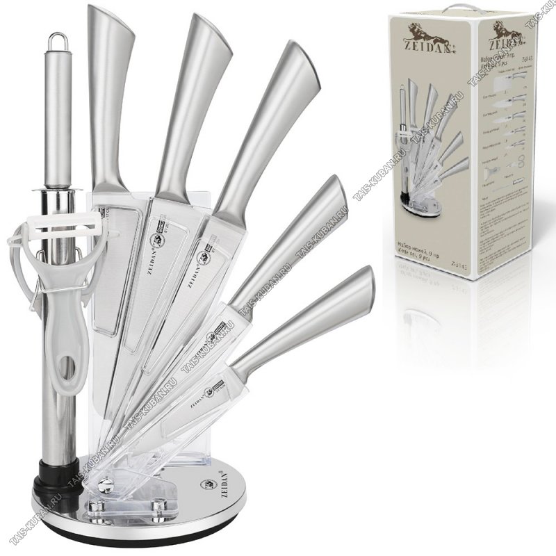 Набор цельнометаллических ножей 8предметов на складной подставке (нож-топорик L17см/поварской 20см/разделочный 20см/универсальный 12,5см/д/овощей 9см/мусат/ножницы/овощечист поперечная) (6)