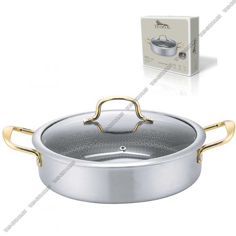 Allegro (нерж с а/п) Жаровня d28см,прям борт h7см,индукц.капсул.дно,ручки-скобы цельные "золото",внутр.узор "соты",стекл.крыш ручка-скоба "золото",матов,п/у (6)