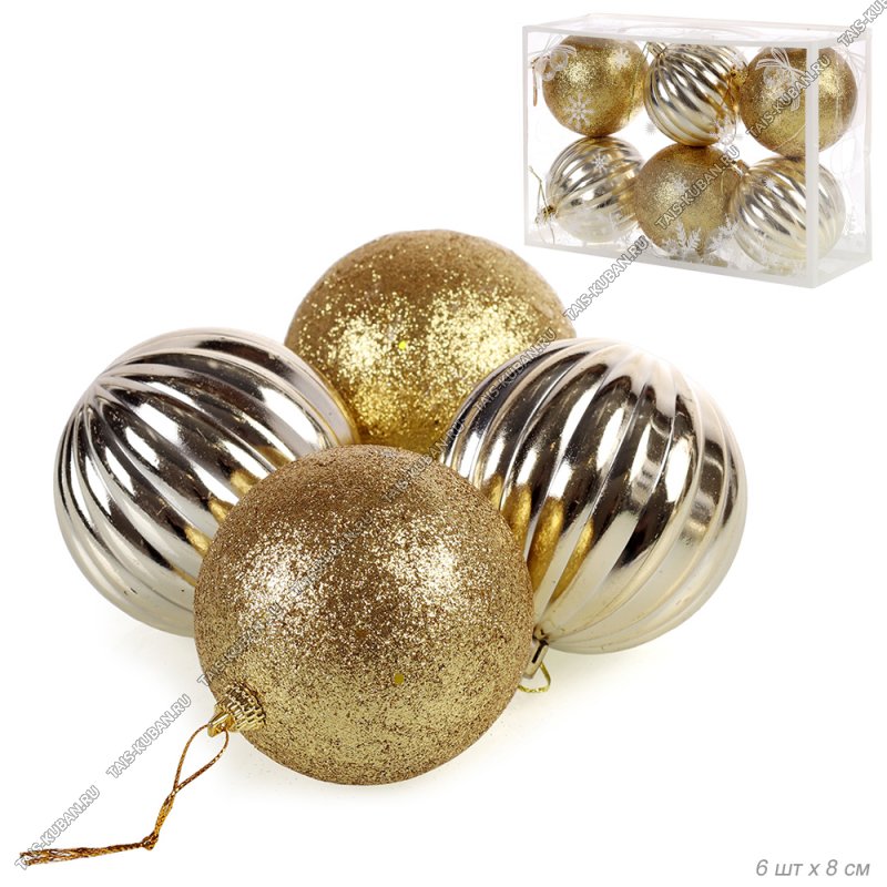 Ёлочный шар н-р 6шт d8см, золото "Ассорти" пластик п/у (64)