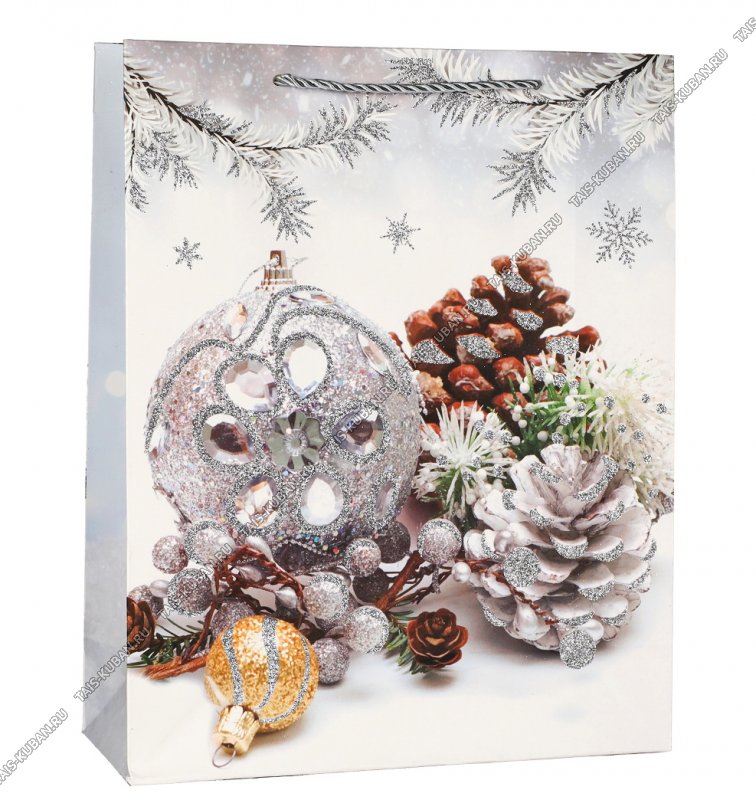 Пакет бумажный (h24х18см, дно8,5см) "Серебристый/Шар и шишки" с блестками (12)