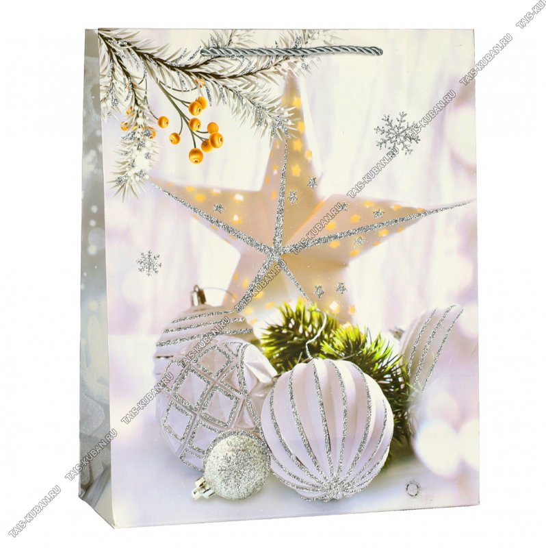 Пакет бумажный (h24х18см, дно8,5см) "Серебристый/Звезда и шары" с блестками (12)