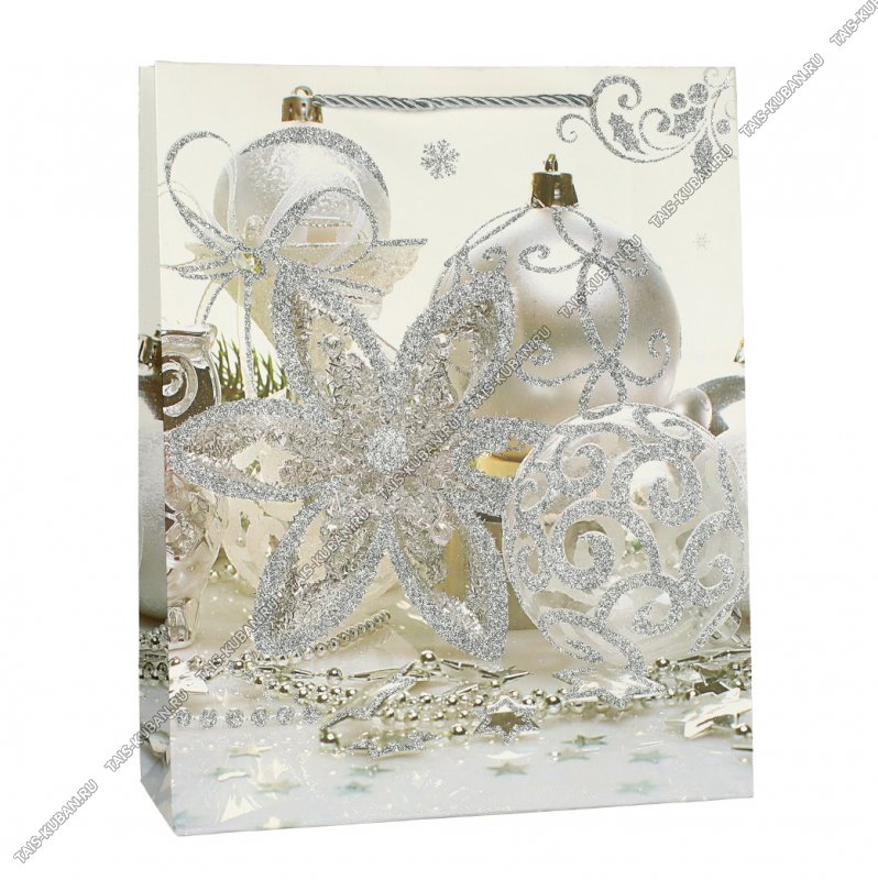 Пакет бумажный (h24х18см, дно8,5см) Пакет бумажный (h24х18см, дно8,5см) "Серебристый/Звезда и шары" с блестками (12)