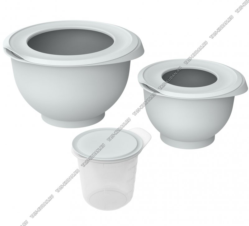 Миска д/работы с миксером Н-р 3шт "Кулинар" серый 5,3л+2,1+мерн.стакан с крышк 0,7л (d27 h17см/d19,5 h13см/d12 h11см) крыш.с отверст-2шт,прорез.ножки (12)