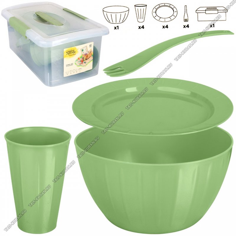 Набор д/пикника 4 персоны 15предметов,фисташк (контейнер,салатник 1,7л,салатник 0,6л 4шт,вил 4шт,тарелка дес.4шт) Пластик Репаблик (8)