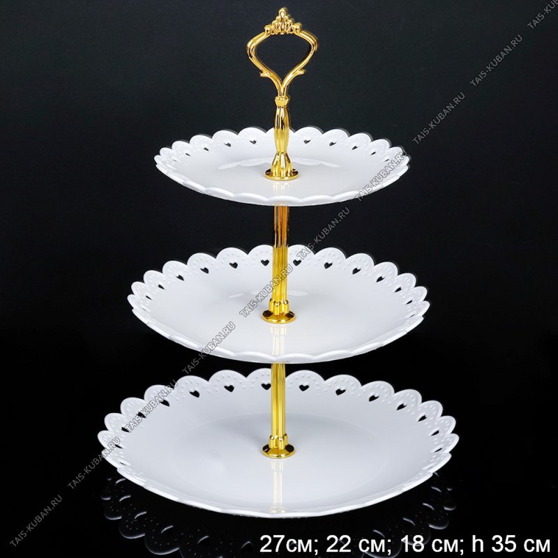 Фруктовница 3-х яр, кругл (d18/22/27 h35см) "Кружево/Белый" резной край,золот.креплен (75)